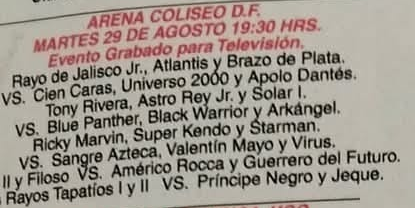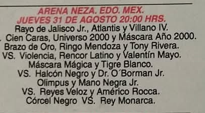 1) Rayo de Jalisco Jr. vs Atlantis, Hijo del Lizmark, Brazo de Plata, Cien Caras, Máscara Año 2000, Universo 2000, Shocker, Último Guerrero, Emilio Charles, Mr. Niebla, Tigre Blanco, Rey Bucanero, Mr. México, Rencor Latino