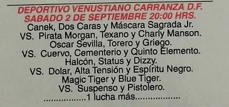 5) Dos Caras Sr., el Hijo del Perro Aguayo, Sangre Chicana DQ Espectro Jr., Pirata Morgan, Texano *