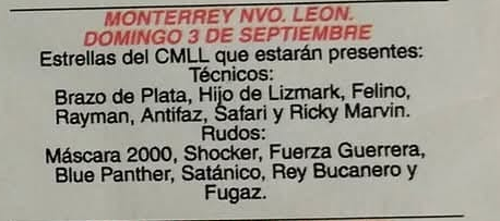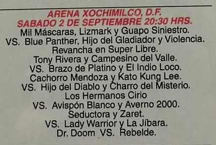2) Cougar vs Voyager, Jibarito I, Jibarito II, Ciclón Plateado, Rayito De Oro, Tigre Imperial, Príncipe Egipcio, Centella De La Muerte, Gama De Oriente, Quinto Poder, Desafio, Estrellasin Fin, Alas De Plata, Lobo Solitario, Glatar, Súper Mago, Cuymagico, Índio Loco, Trolo Punk, Dr. Karonte, Mr. Conog, Cóndor Azul, Tigre Negro, Superlanger, Chicanio Infernal, Elegnete Negro, Súper Colt, Aspia, Asmodeous, Vikingo Rojo, Zancudo Guerra I, Zancudo Guerra II