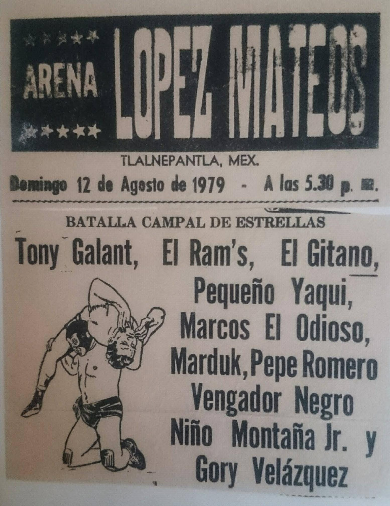 1) Tony Galant vs El Rams, El Gitano, Pequeño Yaqui, Marcos El Odioso, Marduk, Pepe Romero, Vengador Negro, Niño Montaña Jr., Gory Velázquez
