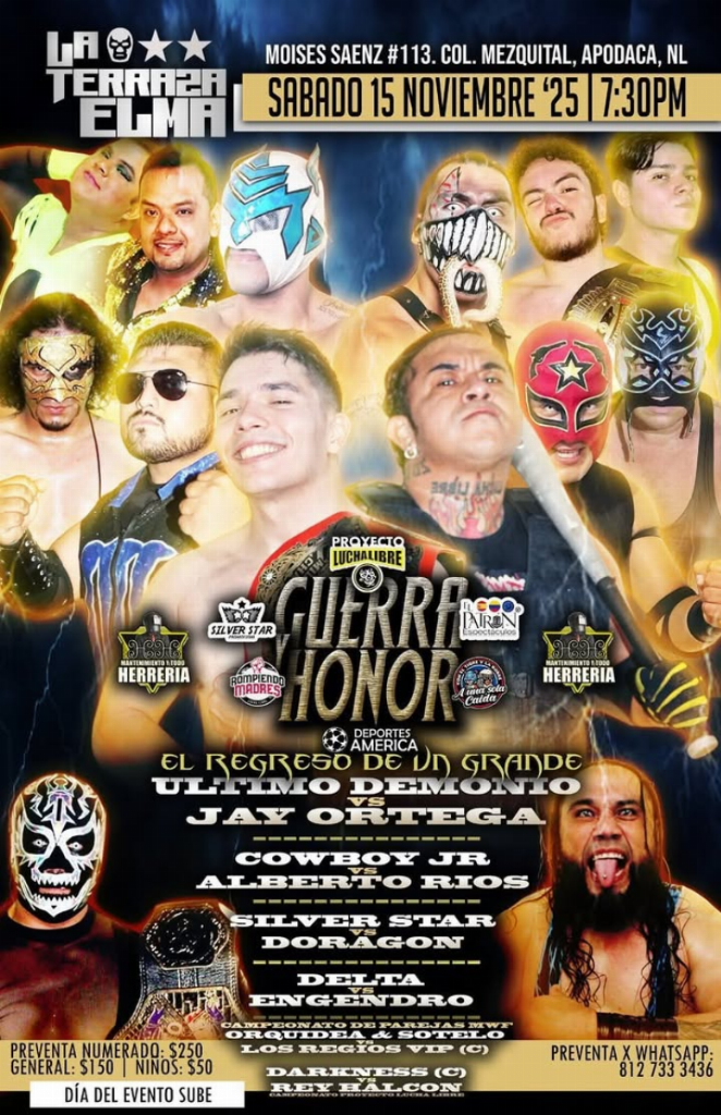 Proyecto (SAT) 11/15/2025 Terraza Elma, Apodaca, Nuevo León 1) Darkness © vs Rey Halcón [? CHAMP] 2) Delta vs Engendro 3) Silver Star vs Dragón 4) Cowboy Jr. vs Alberto Rios 5) Último Demonio vs Jay Ortega