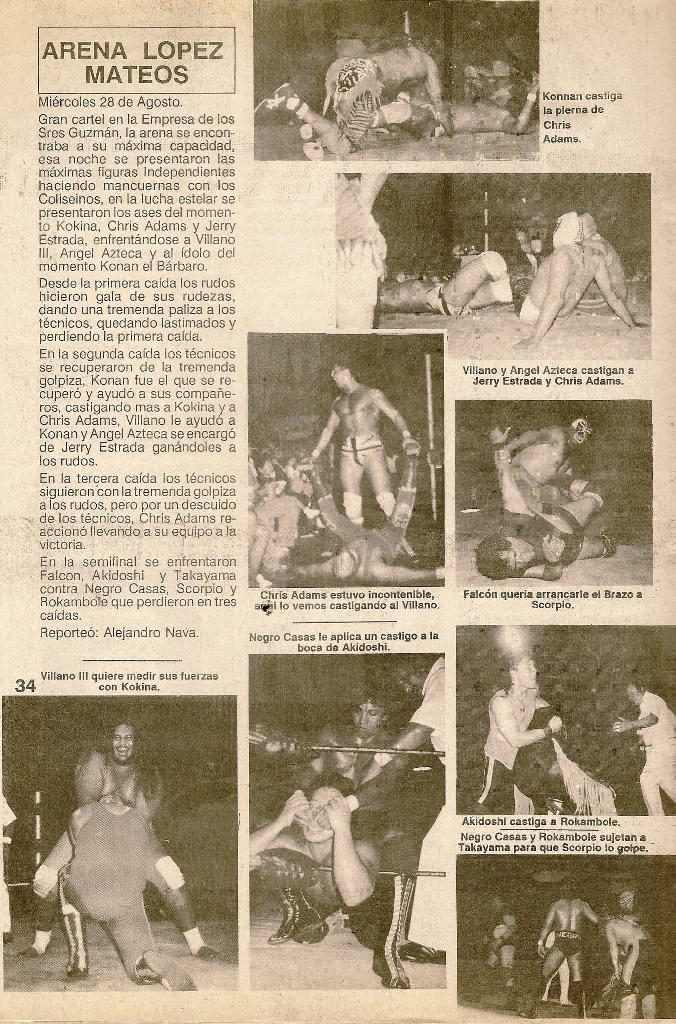 LLI (WED) 08/28/1991 Arena Lopez Mateos [RB] 1) Chris Adams, Jerry Estrada, Kokina b Ángel Azteca, Konnan El Barbaro, Villano III 2) Negro Casas, Rokambole, Scorpió b Akiyoshi, El Falcón, Takayama