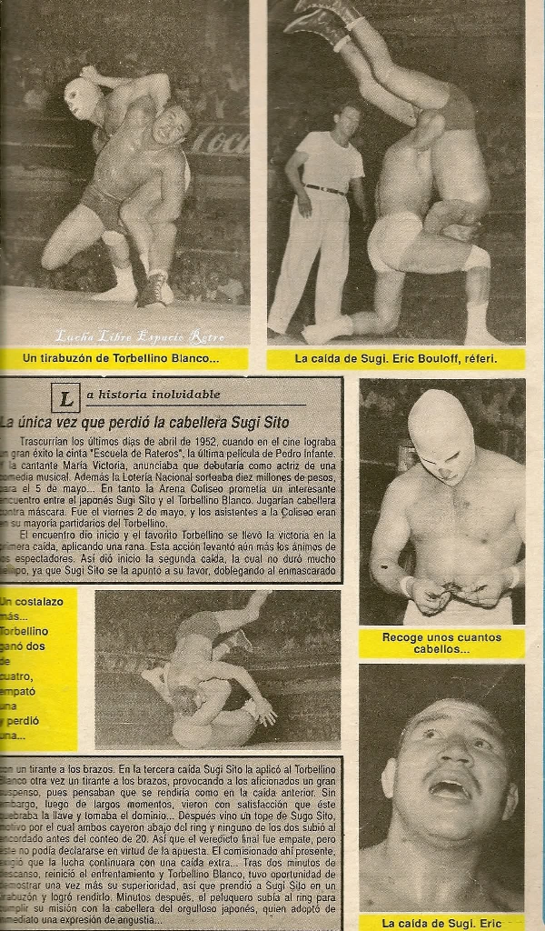 Blanco took fall 1, Sugi Sito 2, both were counted out after a Sito tope in 3. Commission ordered a fourth fall, and Blanco won a couple of minutes later. Said to be the only time Sugi Sito lost his hair.