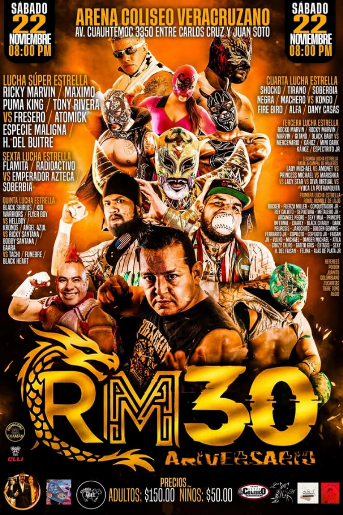 1) Rocker vs Fuerza Miller, Conquistador Jr., Rey Calixto, Sepultura, Metalero Jr., Arcángel Negro, Sexy Mua, Príncipe Infernal, Charly, Black Charly, Dark Neurosis, Jarochito, Golden Geminis, Ferrarito Jr., Copiloto, Copiloto Jr., Faisán Jr., Vulko, Michael, Danger Michael, Atila, Crazy Tauro, Gatito Gris, Éxtasis, Sexy, Hijo del Faisan, Felina, Alas De Plata Jr.