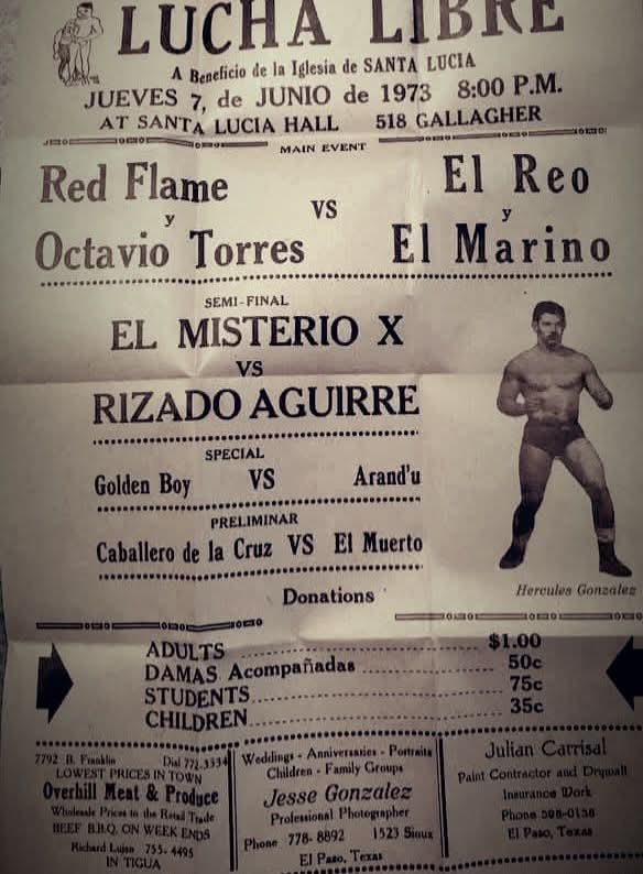 Indy (THU) 06/07/1973 San Lucia Church, El Paso, Texas [RB] 1) Caballero De La Cruz vs El Muerto 2) Golden Boy vs ArandĂș 3) El Misterio X vs Rizado Aguirre 4) Octavio Torres & Red Flame vs El Marino & El Reo
