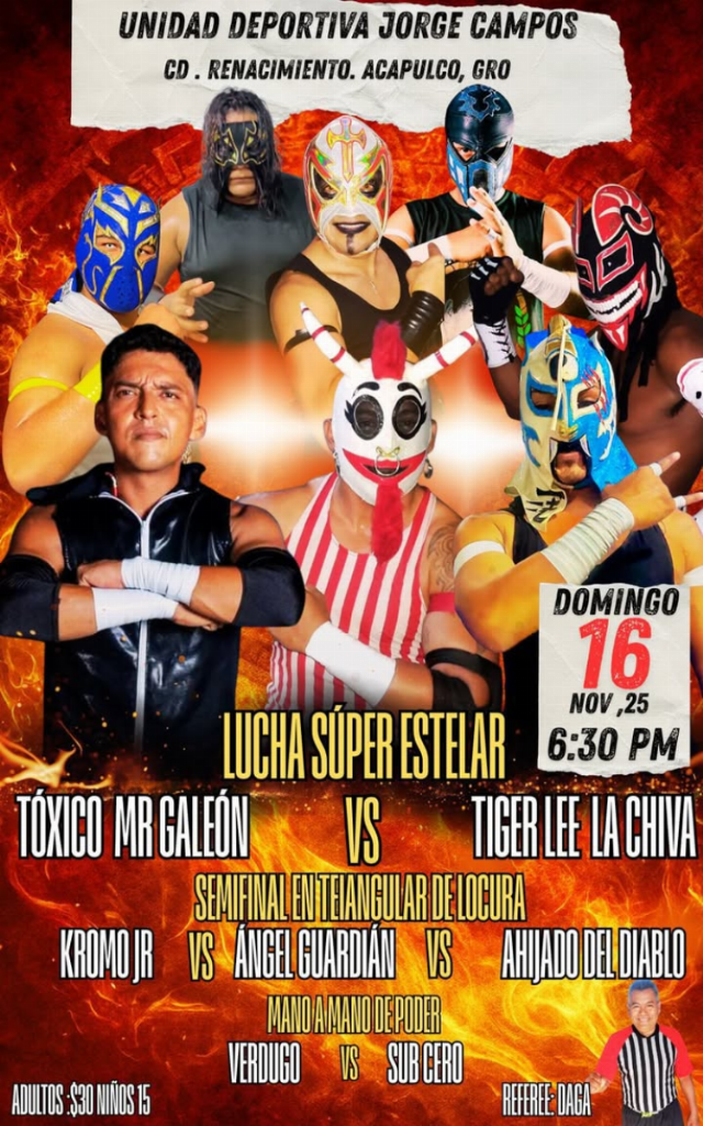 Indy (SUN) 11/16/2025 Unidad Deportiva Jorge Campos Navarrete, Acapulco, Guerrero 1) Verdugo vs Sub Cero 2) Kromo Jr. vs Ángel Guardián, Ahijado Del Diablo 3) Mr. Galeón & Toxico vs La Chiva & Tiger Lee