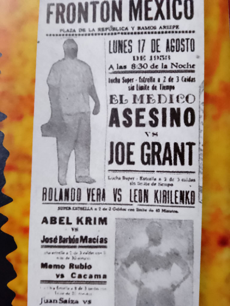 Indy (SUN) 08/17/1958 Frontón México, Cuauhtémoc, Distrito Federal 1) Juan Saiza vs ? 2) Memo Rubio vs Cacama 3) Abel Krim vs José Barbón Macías 4) Rolando Vera vs León Kirilenko 5) Medico Asesino vs Joe Grant