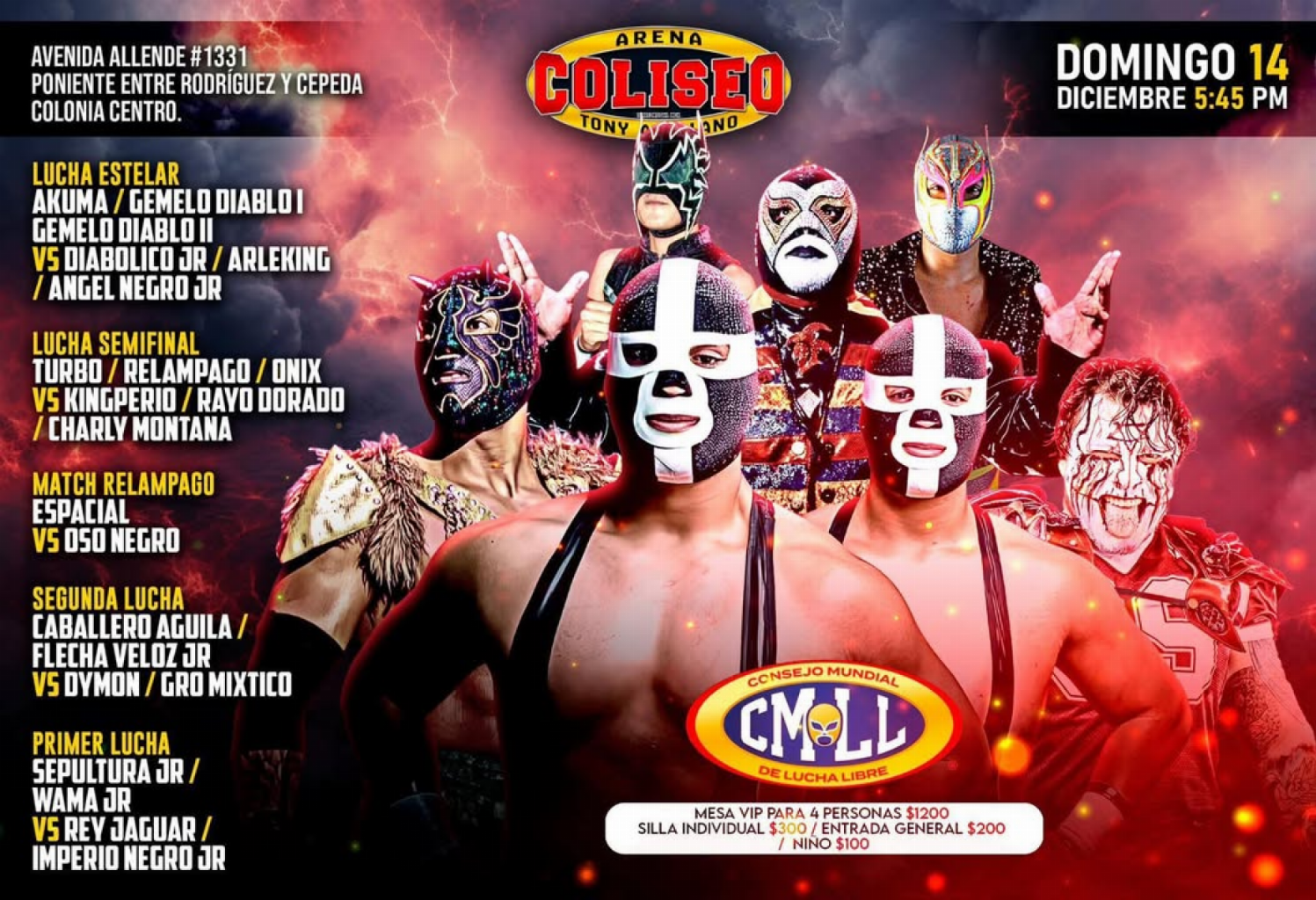 1) Akuma, Gemelo Diablo I (CMLL), Gemelo Diablo II (CMLL) vs Ángel Negro Jr., Arleking, Diabólico Jr.