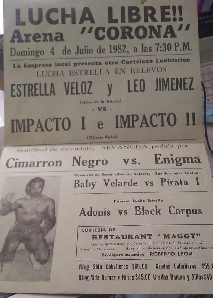 Indy (SUN) 07/04/1982 Arena Corona, Nogales, Sonora 1) Adonis vs Black Corpus 2) Baby Velarde vs Pirata I 3) CimarrĂ³n Negro vs Enigma 4) Estrella Veloz & Leo Jimenez vs Impacto I & Impacto II