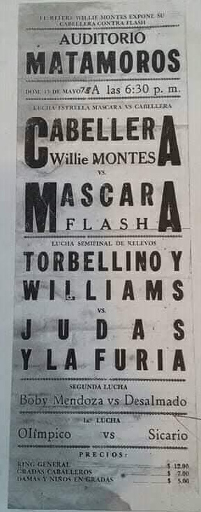 Indy (SAT) 05/13/1978 Auditorio Matamoros, Matamoros, Tamaulipas 1) OlĂmpico vs Sicario 2) Boby Mendoza vs Desalmado 3) Torbellino & Williams vs Judas & La Furia 4) Willie Montes vs Flash [hair, mask]