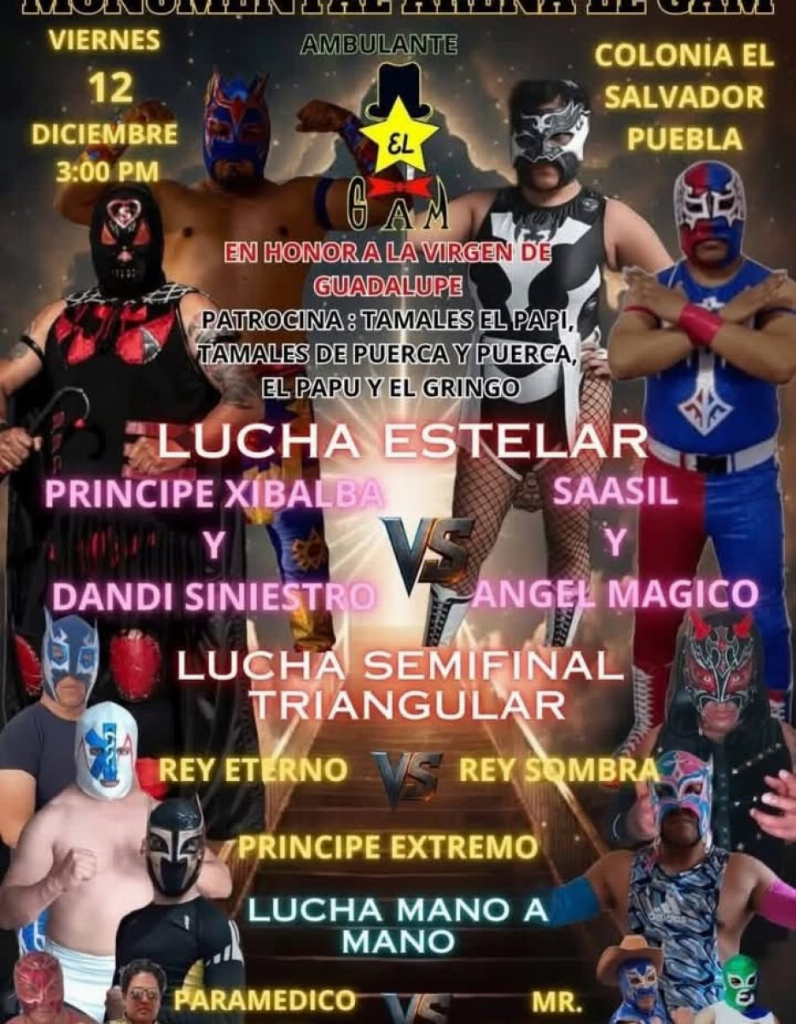 Indy (FRI) 12/12/2025 Arena el Gam, Puebla, Puebla 1) Paramédico vs ? 2) Rey Eterno vs Rey Sombra, Príncipe Extremo 3) Dandi Siniestro & Príncipe Xibalba vs Ángel Mágico & Saasil