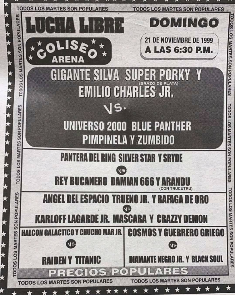5) Emilio Charles Jr., Gigante Silva, Súper Porky vs Blue Panther, Pimpinela Escarlata, Universo 2000, Zumbido