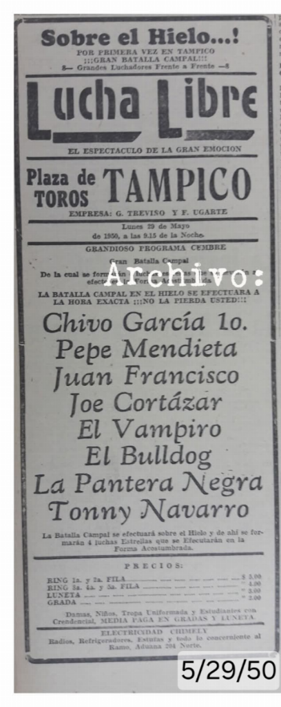 Indy (MON) 05/29/1950 Plaza de Toros, Tampico, Tamaulipas 1) Chivo García I vs Pepe Mendieta, Juan Francisco, Joe Cortázar, El Vampiro, El Bulldog, Pantera Negra, Tonny Navarro