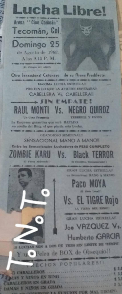 Indy (SUN) 08/25/1968 Arena Cine Coliman, Tecomán, Colima [RB] 1) Joe Vazquez vs Humberto García 2) Paco Moya vs El Tigre Rojo 3) Zombie Karu vs Black Terror 4) Raúl Monti vs Negro Quiroz [hair]