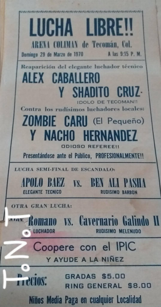Indy (SUN) 03/29/1970 Arena Cine Coliman, Tecomán, Colima [RB] 1) ? Romano vs Cavernario Galindo II 2) Apolo Baez vs Ben Ali Pasha 3) Alex Caballero & Shadito Cruz vs Nacho Hernández & Zombie Caru