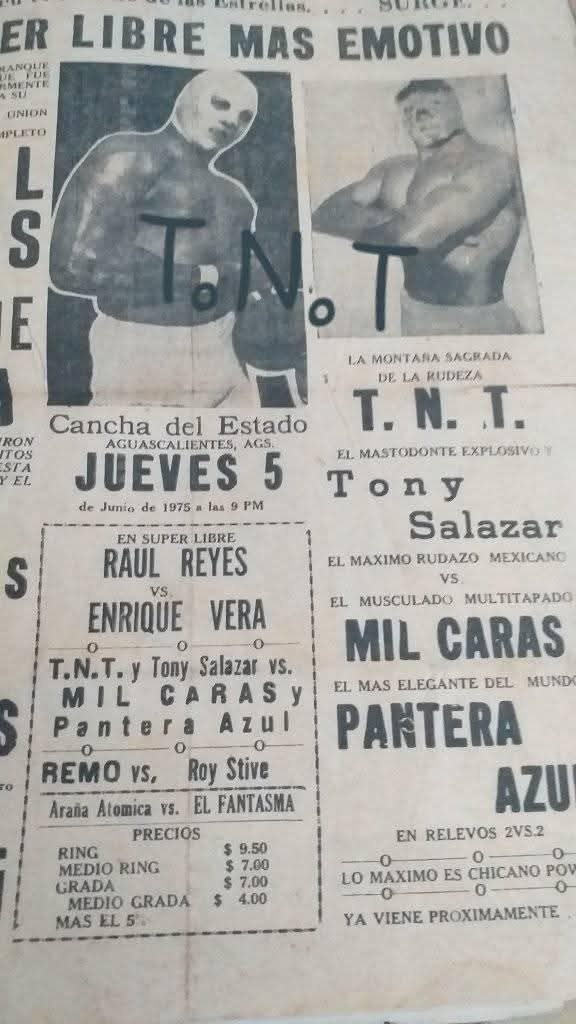 Indy (THU) 06/05/1975 Cancha del Esadio, Aguascalientes, Aguascalientes 1) Araña Atómica vs El Fantasma 2) Remo vs Roy Stive 3) TNT & Tony Salazar vs Mil Caras & Pantera Azul 4) Raúl Reyes vs Enrique Vera
