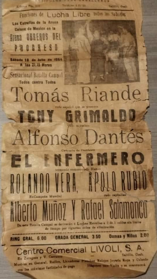 Indy (SAT) 07/18/1964 Arena Obreros del Progreso, Saltillo, Coahuila [RB] 1) Tomás Riande vs Tony Grimaldo, Alfonso Dantes, El Enfermero, Rolando Vera, Apolo Rubio, Alberto Muñoz, Rafael Salamanca [battle oryal]
