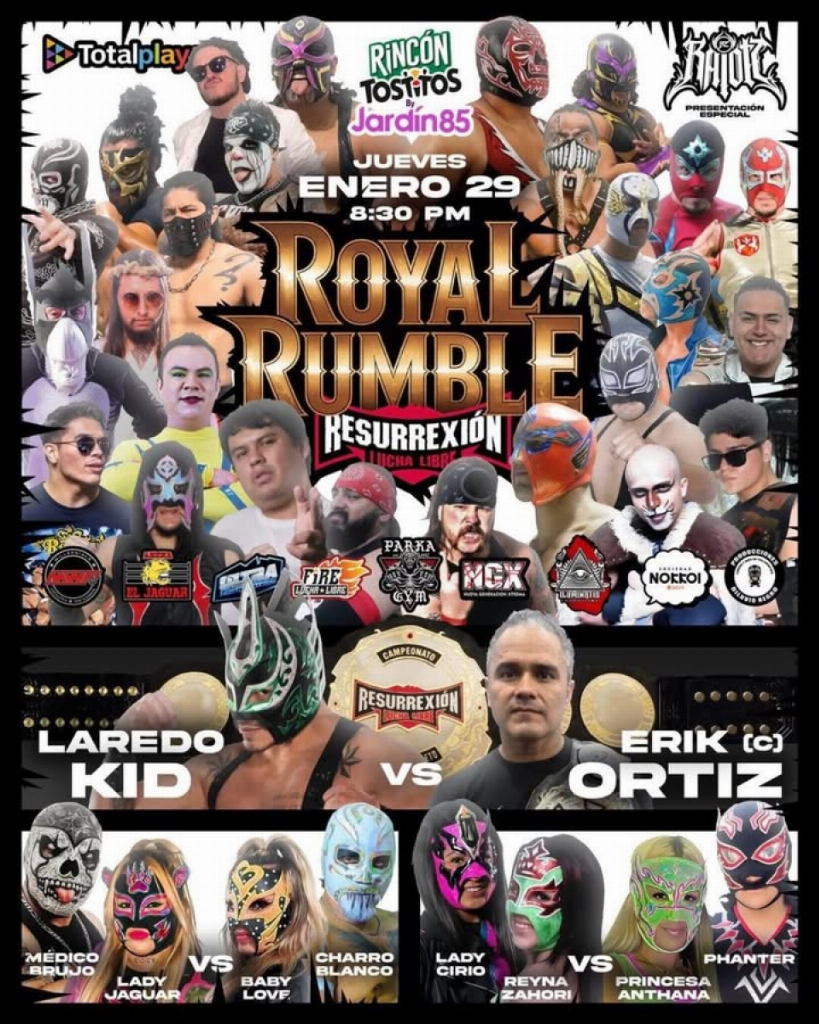 4) Chris Masters vs Charro Negro, Burrito, Lord Byron, Astro Rey Jr., Redimido, Oro Negro, Hijo De Astro Negro, Nossivo, Diluvio Negro Jr., Radar, Kratoz, Martín Eastwood, Difunto I, Duque, Sick Boy, Engendro, Eddy Valle, Jay Ortega, Erika Sotelo, Limbo, Black Cóndor, Imperial, Mr. Puma, Príncipe Solin, Bebote Valdez, Kaientai, Dash, Destroyer [royal rumble]