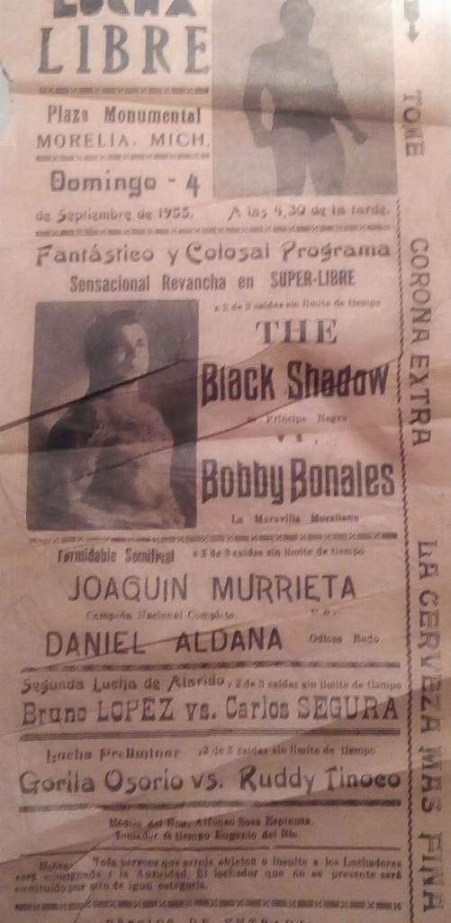 Indy (SUN) 09/04/1955 Plaza Monumental, Morelia, Michoacán [RB] 1) Gorila Osorio vs Ruddy Tinoco 2) Bruno Lopez vs Carlos Segura 3) Joaquin Murrieta vs Daniel Aldana 4) The Black Shadow vs Bobby Bonales