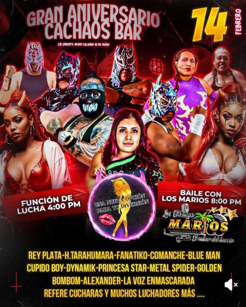 Indy (SAT) 02/14/2026 Gran Aniversario Cachaos Bar, Puebla, Puebla 1) Rey Plata vs Hijo del Tarahumara, Fanatiko, Comanche, Blue Man, Cupido Boy, Dynamik, Princesa Star, Metal Spider, Golden, Sexy Bombón, Alexander