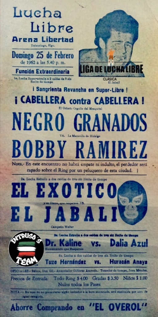 indy (SUN) 02/25/1962 Arena Libertad, Tulancingo, Hidalgo 1) Tuze Hernández vs Huracán Anaya 2) Dr. Kaline vs Dalia Azul 3) El Exótico vs El Jabali 4) Negro Grandos vs Bobby Ramírez [hair]