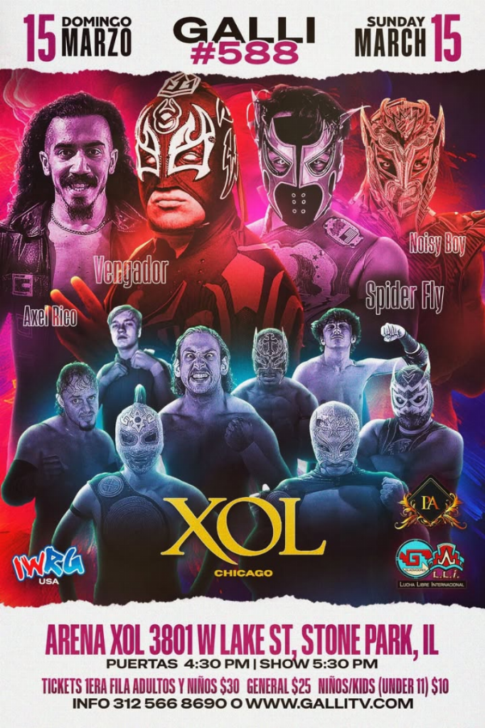 GALLI (SUN) 03/15/2026 Arena XOL, Stone Park, Illinois 1) Axel Rico vs Vengador (Indie), Spider Fly, Noisy Boy