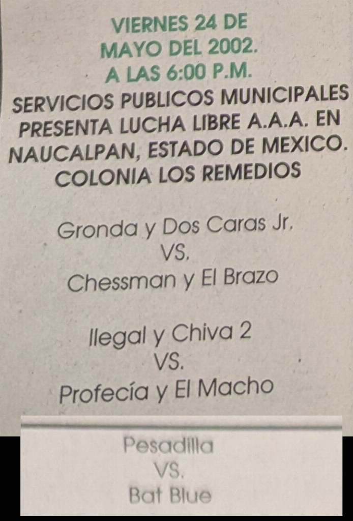 AAA (FRI) 05/24/2002 Naucalpan, Estado de México [La Magia del Ring 148] 1) Pesadilla vs Bat Blue 2) Chiva Rayado II & Ilegal vs Macho I & Profecía 3) Dos Caras Jr. & Gronda vs Chessman & El Brazo