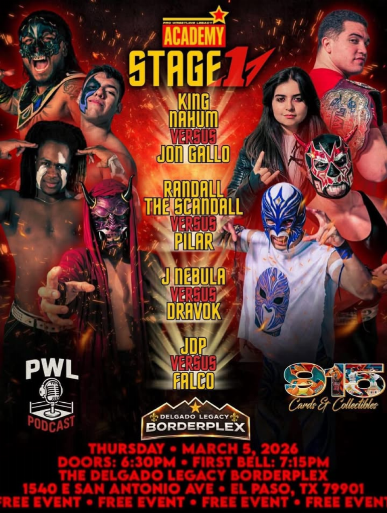 PWL (THU) 03/05/2026 Delgado Legacy Borderplex, El Paso, Texas 1) Jdp vs Falco 2) J Nebula vs Dravok 3) Randall The Scandall vs Pilar 4) King Nahum vs Jon Gallo