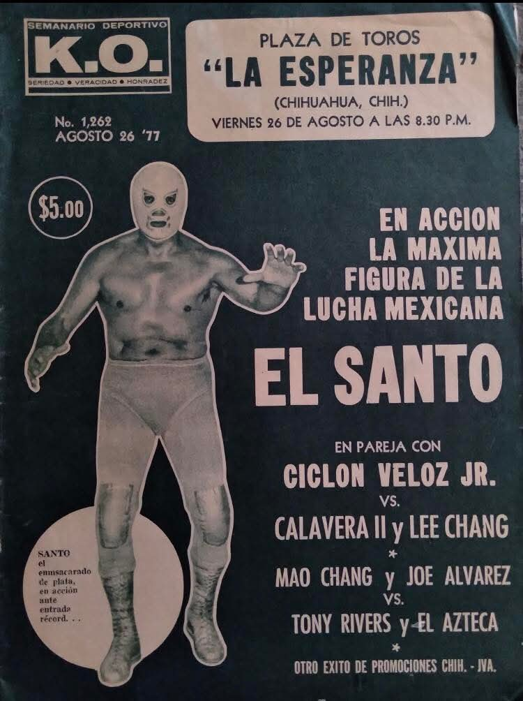 Indy (FRI) 08/26/1977 Plaza de Toros La Esperanza, Ciudad Juárez, Chihuahua [RB] 1) Joe Alvarez & Mao Chang vs El Azteca & Tony Rivers 2) Ciclón Veloz Jr. & El Santo vs Calavera II & Lee Chang