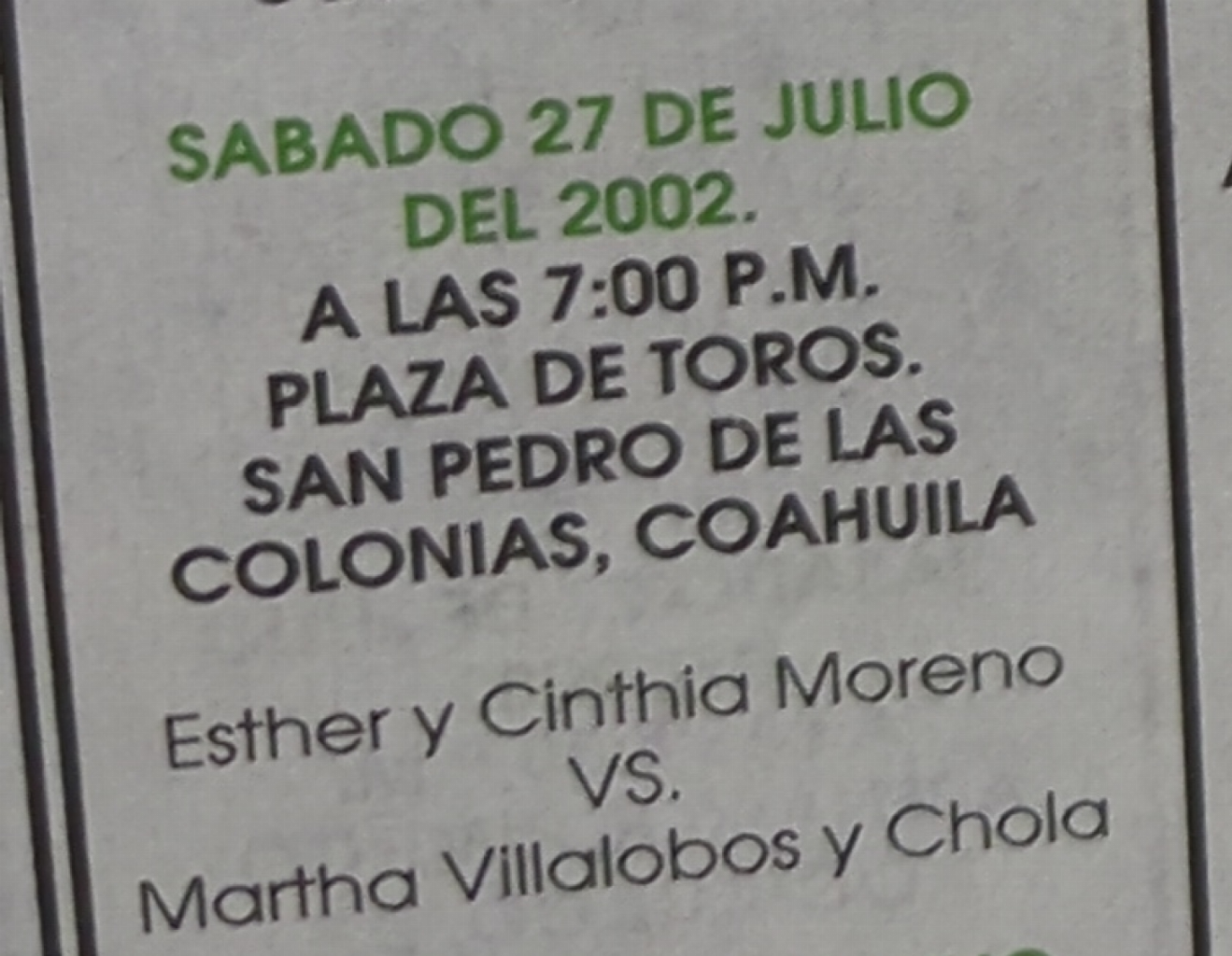 AAA (SAT) 07/27/2002 Plaza De Toros, San Pedro, Coahuila [La Magia del Ring 157] 1) Cinthia Moreno & Esther Moreno vs La Chola & Martha Villalobos