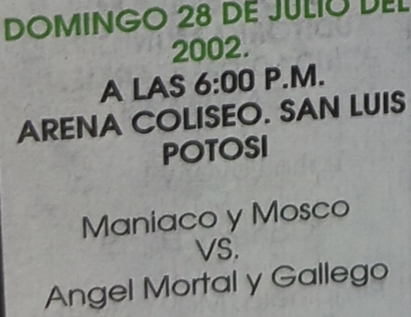 AAA (SUN) 07/28/2002 Palacio de los Deportes, Villahermosa, Tabasco [La Magia del Ring 157] 1) May Flowers, Pimpinela Escarlata, Polvo de Estrellas vs ?, ??, ??? 2) Latin Lover & Zorro vs Canek & Héctor Garza