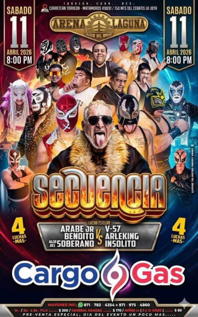 Indy (SAT) 04/11/2026 Arena Laguna, Torreón, Coahuila 1) Arabe Jr., Bendito, Hijo del Soberano vs Arleking, Insólito, V-57