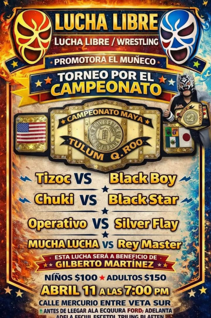 Muneco (SAT) 04/11/2026 Tulum, Quintana Roo 1) Tizoc vs Black Boy 2) Chuki vs Black Star 3) Operativo vs Silver Flay 4) Mucha Lucha vs Rey Master